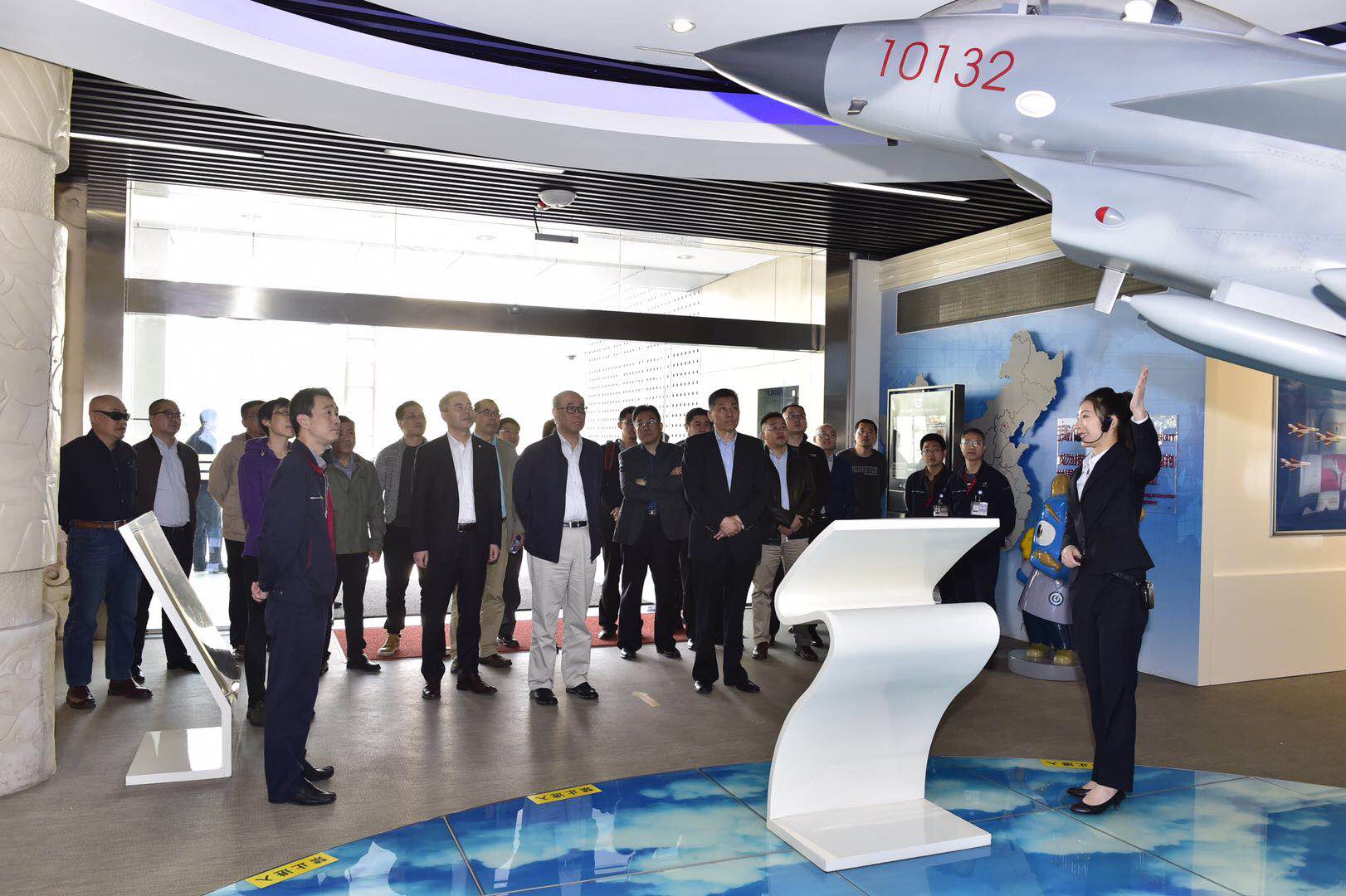 代表們與成飛領導在J-10戰鷹前合影